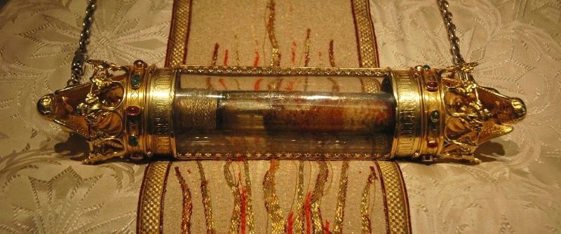 Si la vénération de reliques saintes passe aujourd’hui pour une excentricité religieuse, cela ne fut pas toujours le cas au cours de l’Histoire. Au Moyen Âge, on remue Ciel et Terre pour en obtenir : morceaux de la croix du Christ, dents, ossements, bijoux, étoffes, cheveux… Même la poussière arrachée au tombeau des saints se boit, mêlée à de l’eau, en infusion aux XIe et XIIe siècles ! On peut morceler à l’infini les corps des saints pour orner amulettes, talismans et pendentifs. La conscience populaire donne à ces objets des propriétés miraculeuses : le pouvoir d’éloigner les tempêtes, d’éradiquer les épidémies, de protéger leur porteur d’éventuelles afflictions ou malédictions… Naturellement, la forte demande de reliques alimente non seulement le pillage de sépultures sacrées, mais aussi la vente de contrefaçons. On vénère par exemple, en différents points du globe, pas moins de douze crânes de Saint Jean Baptiste en même temps !