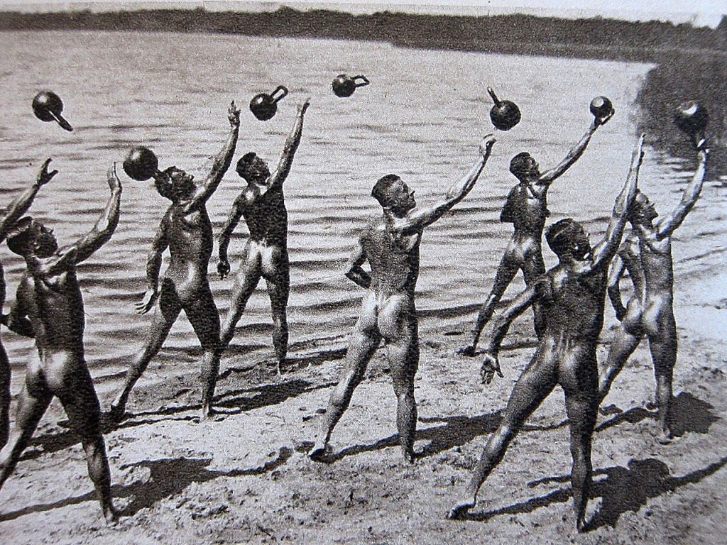 Afin d’échapper aux purges, les associations naturistes se conforment aux exigences raciales du parti, excluant les membres non-aryens et les agitateurs politiques soupçonnés. Début 1934, Hitler donne sa bénédiction aux allergiques du textile, récupérant l’idéologie naturiste pour servir ses propres intérêts : selon lui, les remèdes naturalistes à base d’air, de soleil et de nudité permettront de rendre aux Allemands leur « pureté » originelle, socle de l’État pangermanique qu’il compte bâtir. La propagande nazie tisse également des liens avec les traditions des ancêtres germains, chevaliers Teutoniques et Vikings en tête, qui dans leur religion païenne vénéraient les arbres, les sources, le vent et l’eau. Ainsi, la nudité devient instrument de propagande – un moyen de promouvoir la virilité et la supériorité physique de la race aryenne… clichés de biceps huilés à l’appui.
