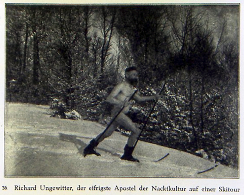 Pionnier de la FKK, Richard Ungewitter est l’un de ces réformateurs. Végan avant l’heure, pas frileux pour un sou, il rédige nu à son bureau Die Nacktheit (« la nudité ») qui rencontre un certain succès dans l’entre-deux-guerres. Dans les années 1930, ses théories se mâtinent de rhétorique haineuse : Ungewitter se fait chantre de « l’hygiène raciale » et condamne ouvertement les populations étrangères coupables, à ses yeux, « d’empoisonner » l’Allemagne.