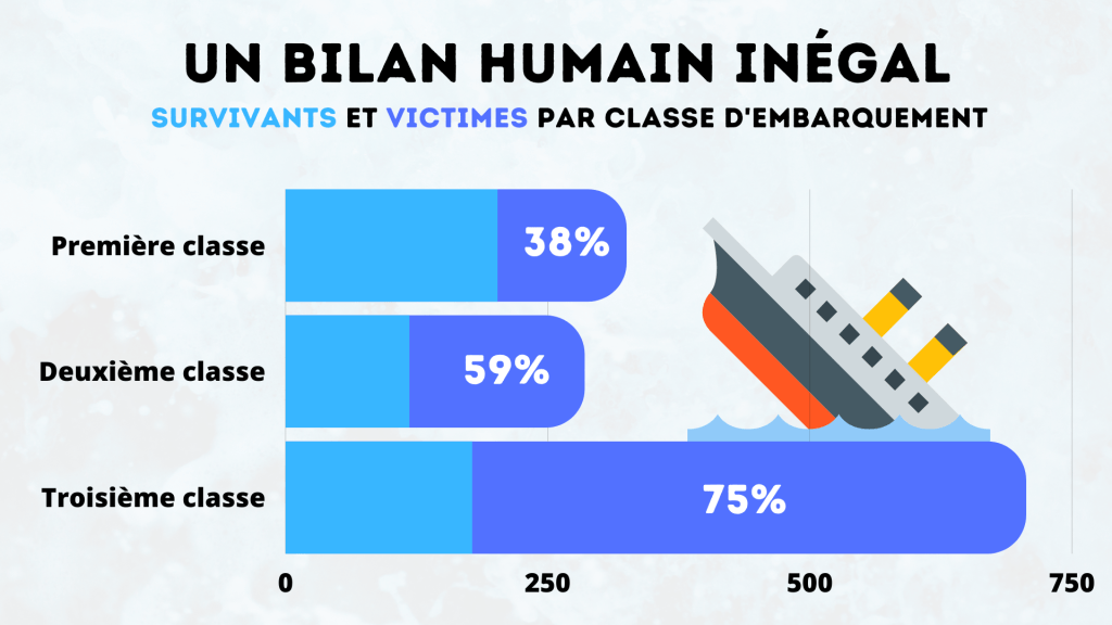 Tout s’enchaîne très vite. Le premier canot de sauvetage est affalé vers 00h45. Selon la coutume maritime, les femmes et les enfants sont évacués d’abord. L’orchestre continue de jouer des airs rythmés afin de ne pas céder à la panique. Minute après minute, les hommes assistent à la descente de canots à moitié remplis sur le miroir d’eau noire.