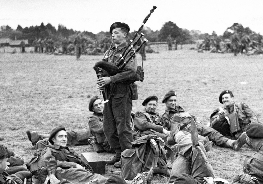 C’est une tradition dans la brigade de Lord Lovat que d’avoir un « piper » dans l’unité, même si l’armée en déconseille l’utilisation depuis les pertes essuyées pendant la Grande Guerre. Certes, la peau de mouton est une piètre protection face aux éclats de shrapnel… Mais lorsque son musicien lui a fait remarquer que les Britanniques n’autorisaient plus les joueurs de cornemuse dans leurs rangs, son chef de clan lui a rétorqué : « Ah, mais il s’agit du Bureau de la Guerre anglais. Nous sommes tous deux Écossais, et ce règlement ne s’applique sûrement pas. »