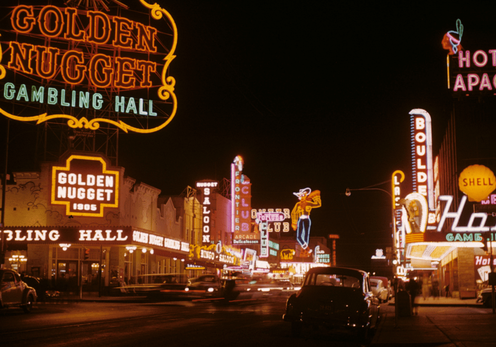 Surréaliste, cette scène est familière aux habitués de Las Vegas. Depuis quelques temps, la métropole s’est inventée un nouveau nom de scène – « Atomic City ». Pour faire face aux pertes sèches de la Grande Dépression, la ville a légalisé les jeux d’argent en 1931. Des patrons du crime organisé en ont fait leur nouveau terrain de jeu, ouvrant casinos et hôtels de luxe. Chaque année, huit millions de touristes viennent y taquiner la roulette, injectant 200 millions de dollars dans ce paradis du divertissement où la nuit est reine.