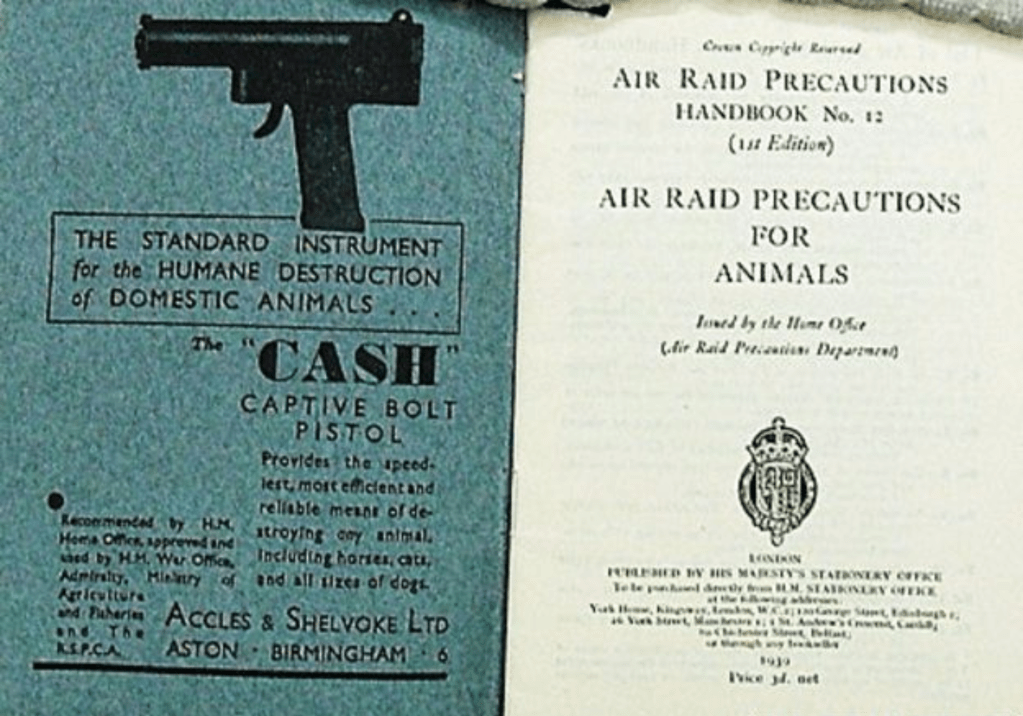 La faute revient également à une communication maladroite de la part du gouvernement britannique. En août 1939, le National Air Raid Precautions Animals’ Committee (NARPAC) commença à rassembler de la nourriture pour les bêtes d’élevage, qui représentent 37 millions de têtes de bétail. Que faire, en revanche, des 6 à 7 millions de chats et de chiens vivant en Angleterre ? L’organisme fait distribuer une brochure intitulée « Conseils aux propriétaires d’animaux », massivement relayée par les journaux et la radio. Le texte suggère d’expédier les chats et les chiens vers la campagne, moins ciblée par les raids. « Lorsqu’un propriétaire n’a pas été en mesure d’envoyer son chien ou son chat dans un endroit sûr ou de prendre d’autres dispositions appropriées pour le protéger, conseille le texte, il doit envisager la possibilité de l’éliminer sans douleur. » Explicites, les dernières pages du manuel détaillent même un mode d’emploi du pistolet d’abattage…