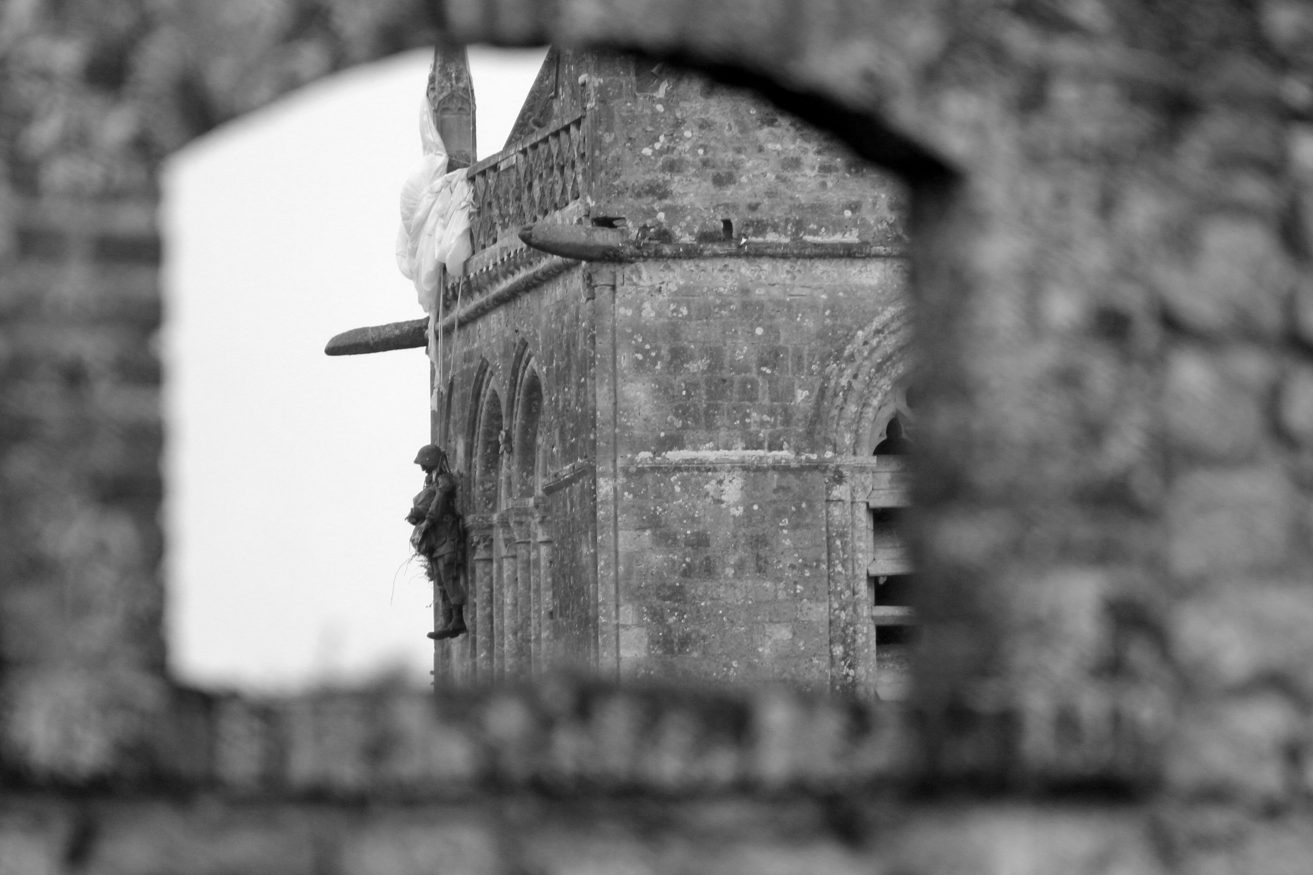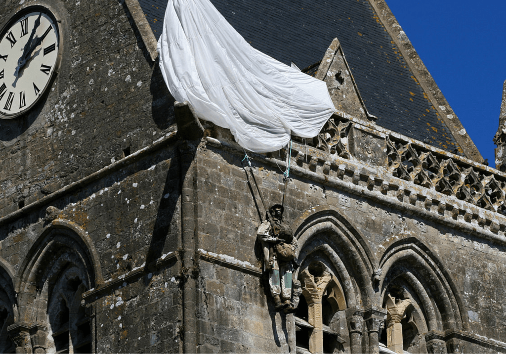 Quelle poisse ! Surtout que ce n’est pas son premier atterrissage raté. Déjà en juillet 1943, alors qu’il était parachuté lors du débarquement de Sicile, il s’était cassé la jambe gauche à l’arrivée, ce qui lui avait valu son rapatriement dans un hôpital militaire. Cette fois, son saut sur le Cotentin est encore plus chahuté. Après qu’un éclat d’obus lui blesse le pied dans la descente, son parachute se prend dans la croix du pignon de l’église de Sainte-Mère. Son corps est projeté contre le mur en pierre de ce bel édifice du XIIe siècle qu’il ne peut pas immédiatement admirer de près car le choc l’assomme et le plonge dans les vapes pendant quelques minutes. Quand il reprend connaissance, toujours un peu sonné, John Steele réalise qu’il est suspendu à plus de 20 mètres au-dessus du sol. Dans son malheur, il a la chance de se retrouver un peu à l’abri des regards, sur l’angle du bâtiment donnant sur le parvis. De là, il aperçoit la place où les combats font rage. Voyant des soldats ennemis passer devant lui, il a la brillante idée de jouer au mort et fait mine de ne plus respirer. Le simulacre fonctionne et lui sauve la vie. Quand il rouvre les yeux, c’est pour assister, impuissant, au massacre de ses compagnons d’armes au loin.