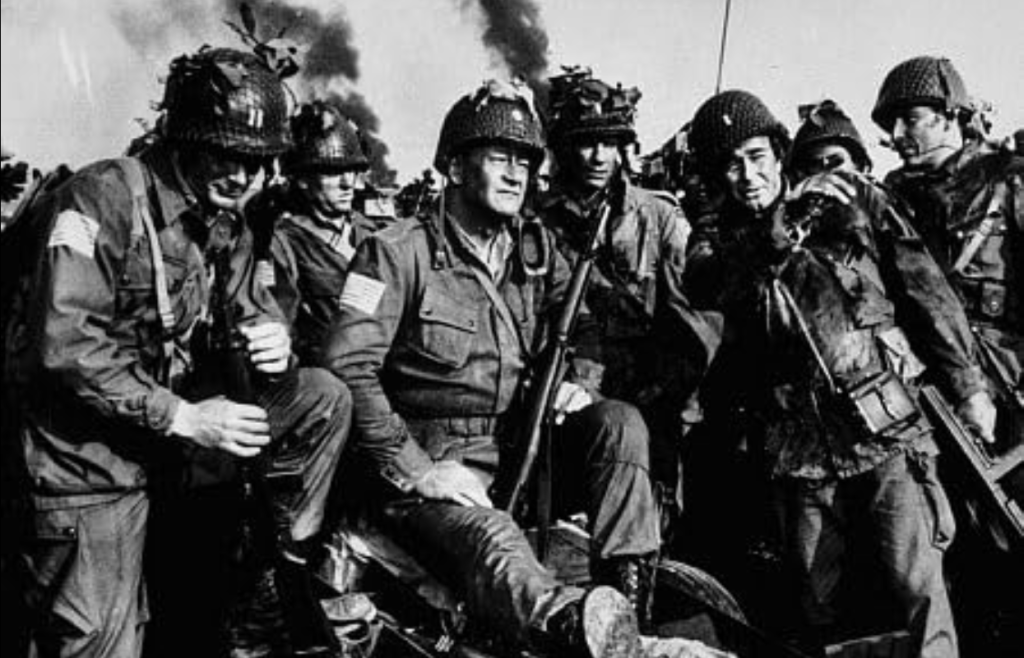 Plusieurs réalisateurs, dont Darryl Zanuck, Ken Annakin et Andrew Marton, se réunissent pour porter le livre de Cornelius Ryan à l’écran. Le résultat : un blockbuster de 172 minutes avec une ribambelle de comédiens stars. Ce n’est ni John Wayne, ni Henry Fonda, ni Sean Connery – pour ne citer qu’eux – qui campent le soldat John Steele, mais la star comique Red Buttons, qui y trouve là le rôle de sa carrière. Sa scène ne dure que 140 secondes, mais elle fait mouche ! Le film, qui sort en France en 1962, cumule 12 millions de spectateurs au box-office. Nommé cinq fois aux Oscars en 1963, il devient si populaire que s’opère un glissement entre la fiction et la réalité. Bientôt, Le Jour le plus long remplace les images d’archives pour évoquer le Débarquement à la télévision et devient une représentation officielle du Jour J. Pourtant, les erreurs historiques sont légion : les « Rupert » prennent la forme de poupées parfaitement habillées, John Steele atterrit du mauvais côté de l’église, face à la place, et devient sourd à cause des cloches qui retentissent dans ses oreilles. Si le tocsin a sonné, peut-être pour signaler l’incendie, cela n’a pas duré bien longtemps, car à l’époque, il fallait le faire manuellement. Pas de quoi rendre sourd un homme !