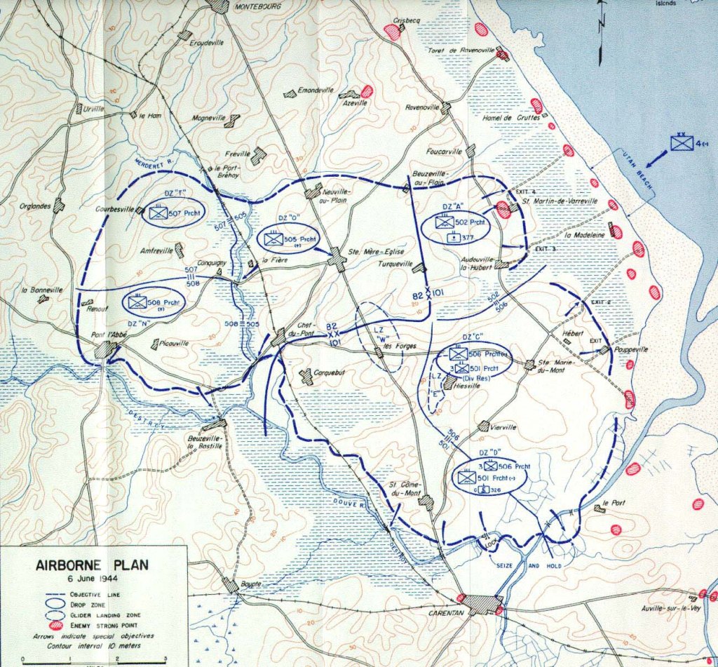 Le 507e régiment de la 82e division se répand, lui, dans le Merderet. Ses hommes s’empêtrent dans leurs parachutes et leurs équipements. Ils sont nombreux à patauger dans les marais ou les champs inondés par les Allemands, quand ils ne trouvent pas la mort en se noyant. La drop zone du 505e régiment de la 82e, celui de John Steele, se situe à 2,5 kilomètres au nord-ouest de Sainte-Mère-Église, à moins de 15 kilomètres de Utah Beach. Son objectif principal ? Prendre le carrefour situé en plein cœur du village, sur la route qui permet de relier les côtes est et ouest du Cotentin. Comme il dessert toutes les plages ainsi que le port de Cherbourg, voilà qui devrait coincer l’ennemi et l’empêcher de se diriger vers les zones prévues pour le Débarquement.